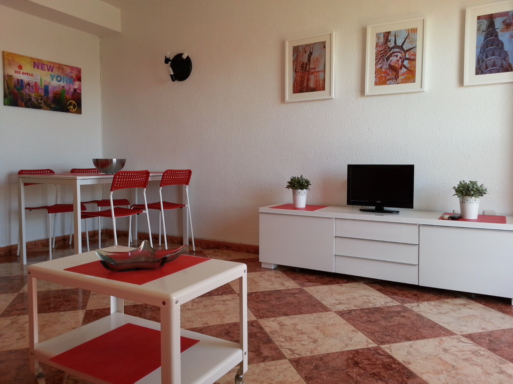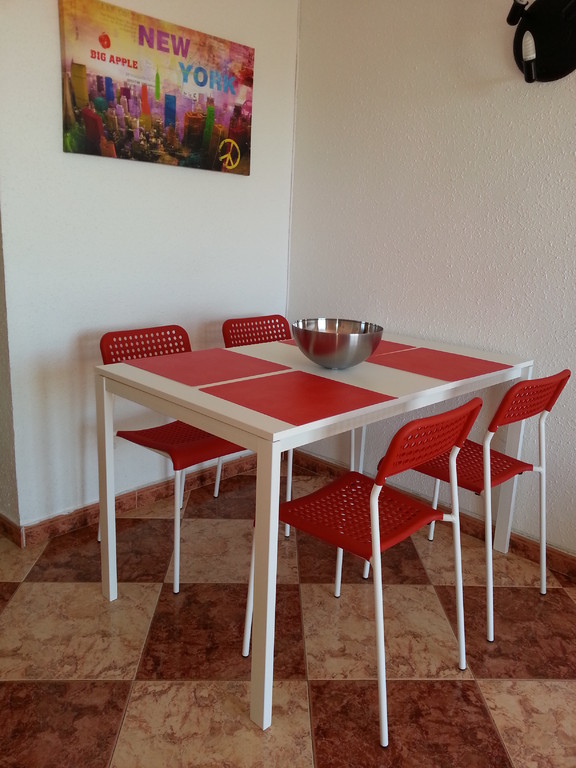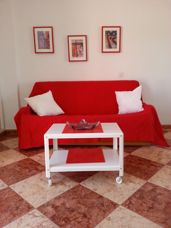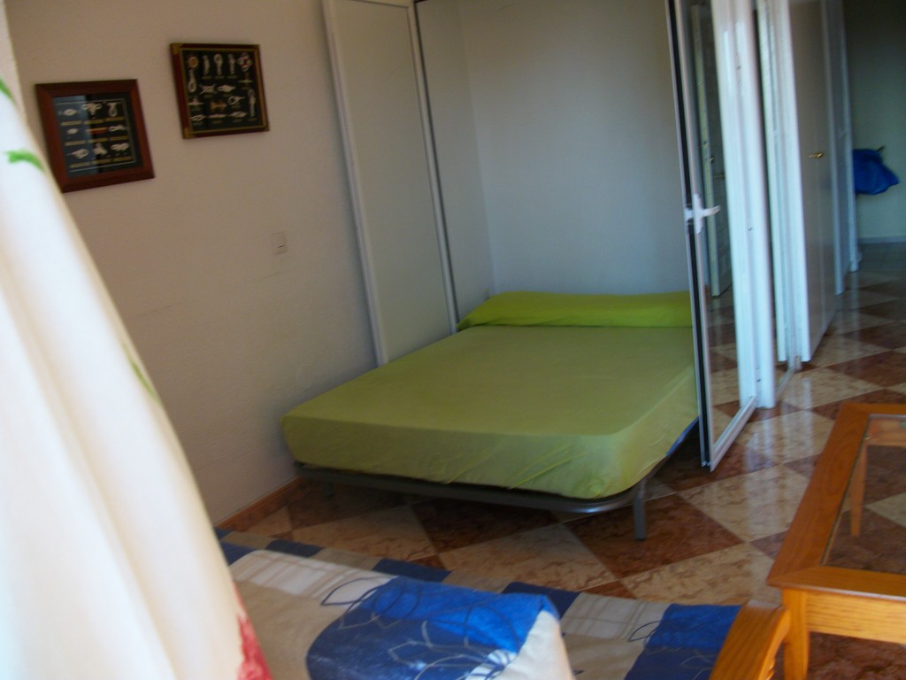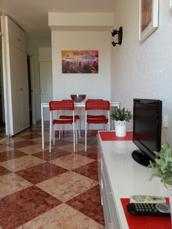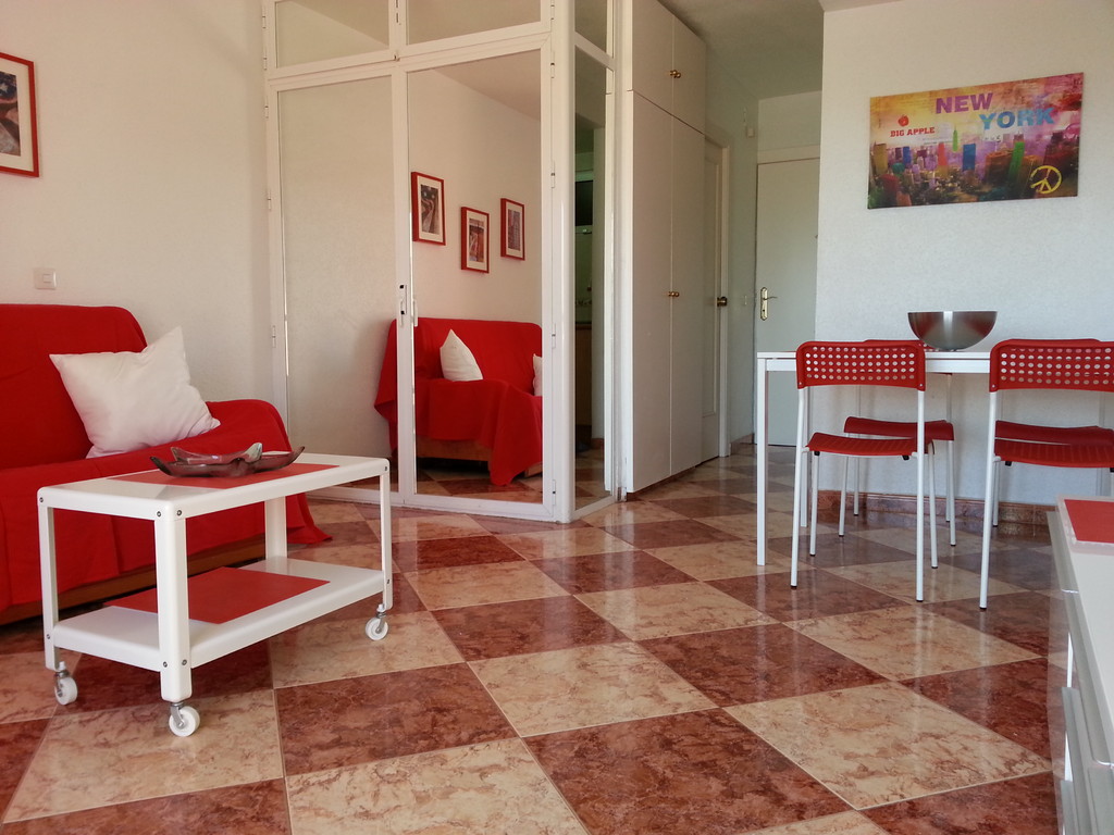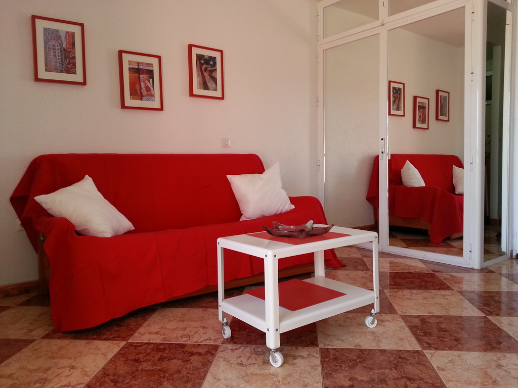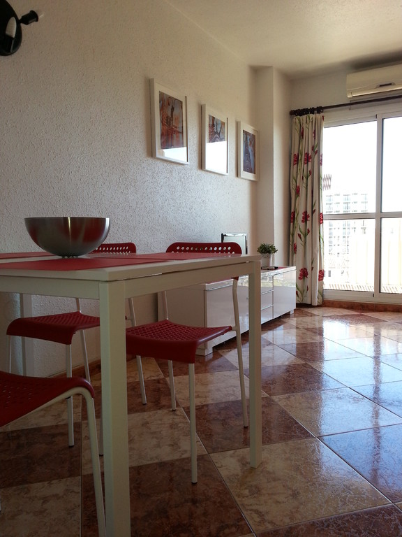 Estudio nº. 412 de Júpiter con vistas al mar. Situado en una cuarta planta con sol de mañana y vistas al mar. Capacidad máxima para tres adultos o dos adultos con dos niños. Dispone de cocina, cuarto de baño, salón y terraza. Cama de matrimonio, sofá cama de matrimonio y supletoria.